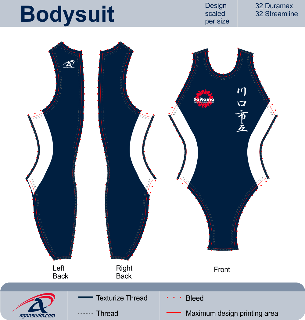 Our Bodysuit has a high neck and a zipper back to provide full coverage. This style is particularly popular for water polo players.