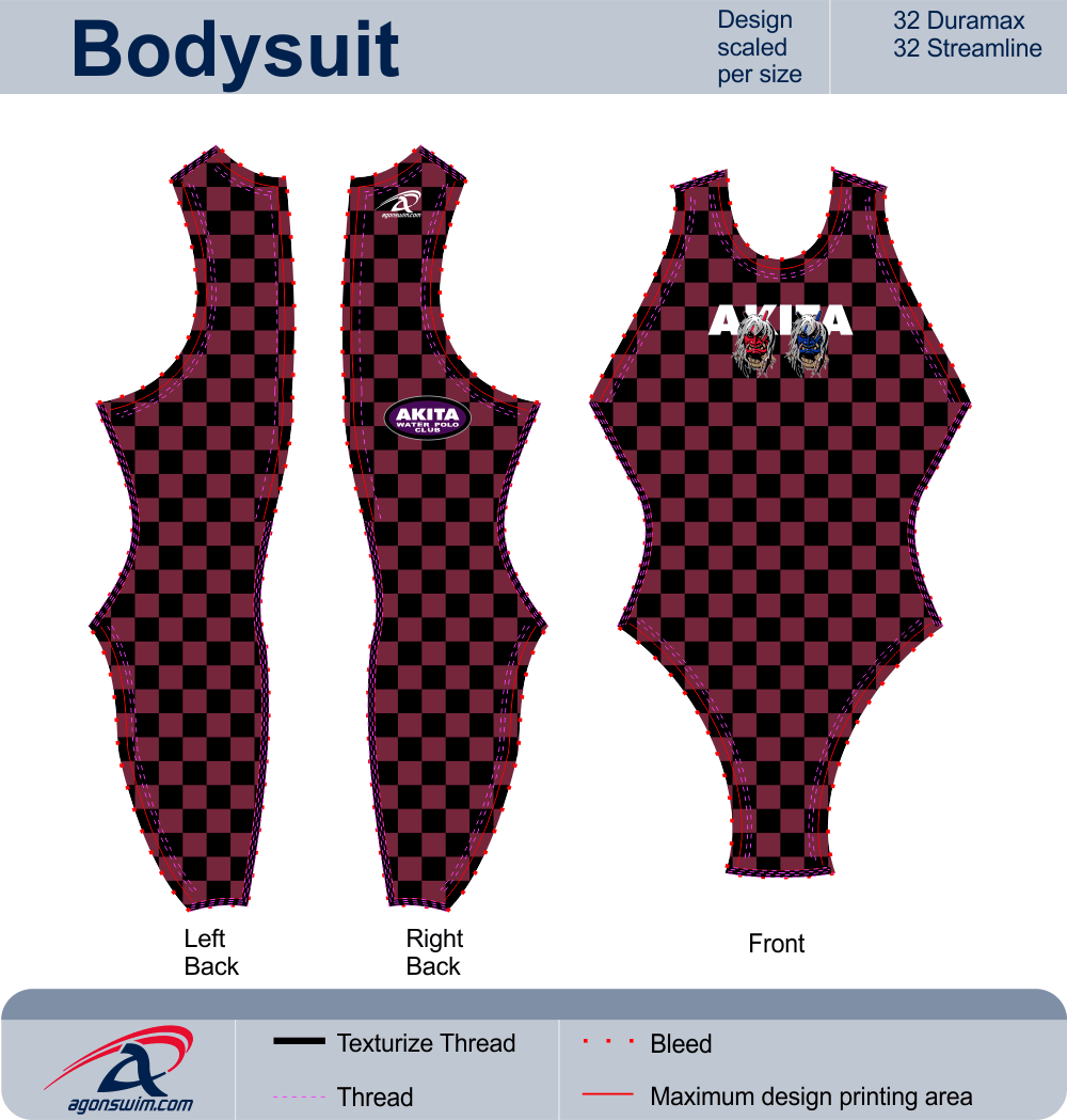 Our Bodysuit has a high neck and a zipper back to provide full coverage. This style is particularly popular for water polo players.