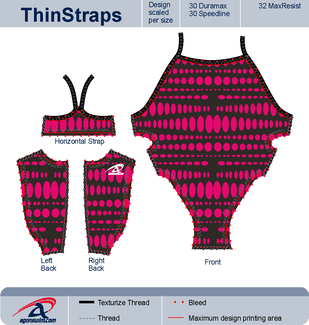 The Thinstrap suit features a slightly scooped neckline with piping and thin straps that form a V in the back where they meet a horizontal band of fabric that provides a bit more support than our strappier backs, with full bottom coverage. (Note: the Thinstrap suit is identical to the Thinstrap 2.0, but is available in a different set of fabrics than the 2.0.)