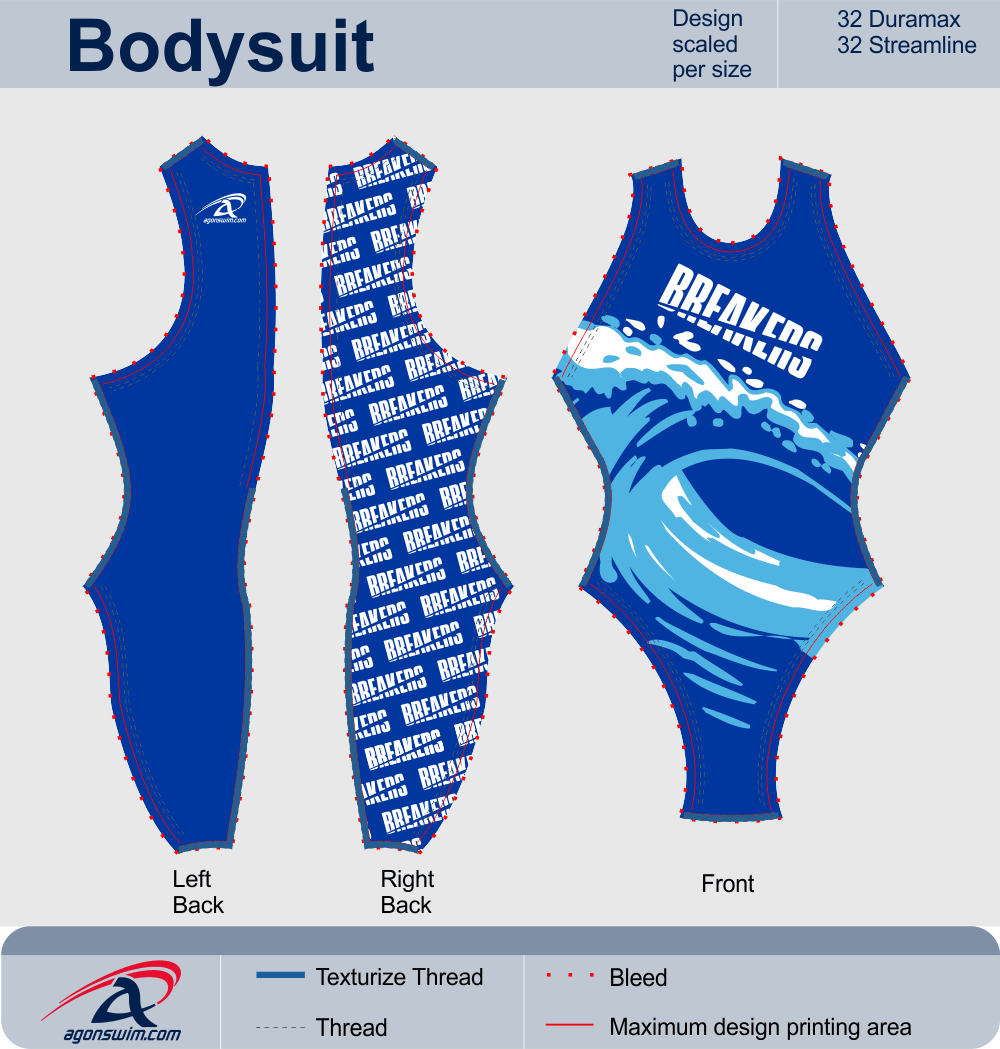 Our Bodysuit 2.0 has a high neck and a zipper back to provide full coverage. This style is particularly popular for water polo players.