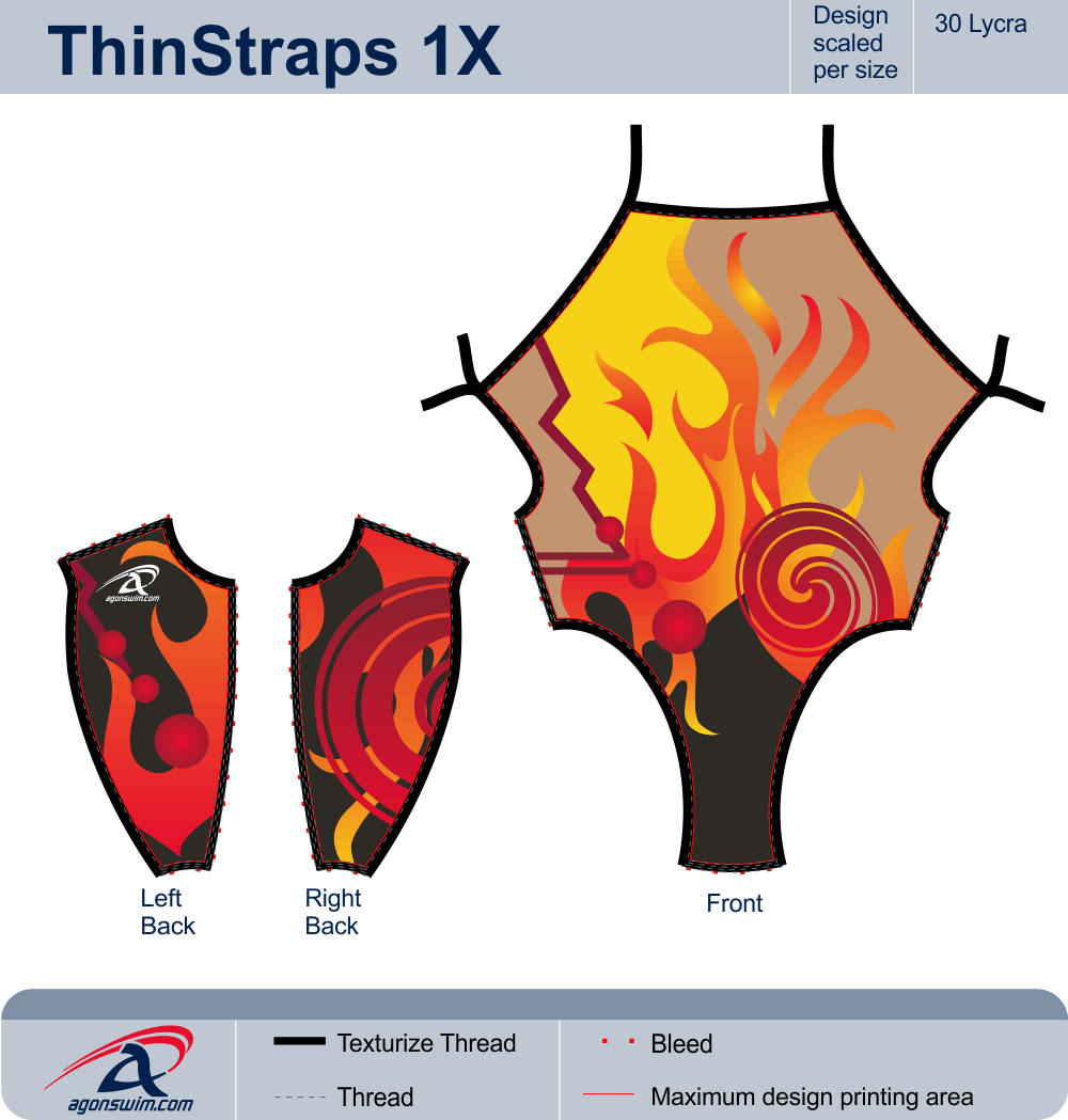 The Thinstrap 1X suit features a slightly scooped neckline and thin straps that cross in the back to form an X, plus a fixed strap that runs horizontally across the back, with full bottom coverage. This suit is reversible.