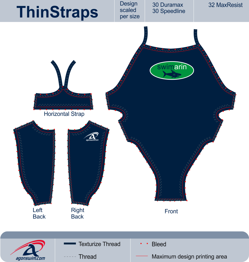 The Thinstrap suit features a slightly scooped neckline with piping and thin straps that form a V in the back where they meet a horizontal band of fabric that provides a bit more support than our strappier backs, with full bottom coverage. (Note: the Thinstrap suit is identical to the Thinstrap 2.0, but is available in a different set of fabrics than the 2.0.)