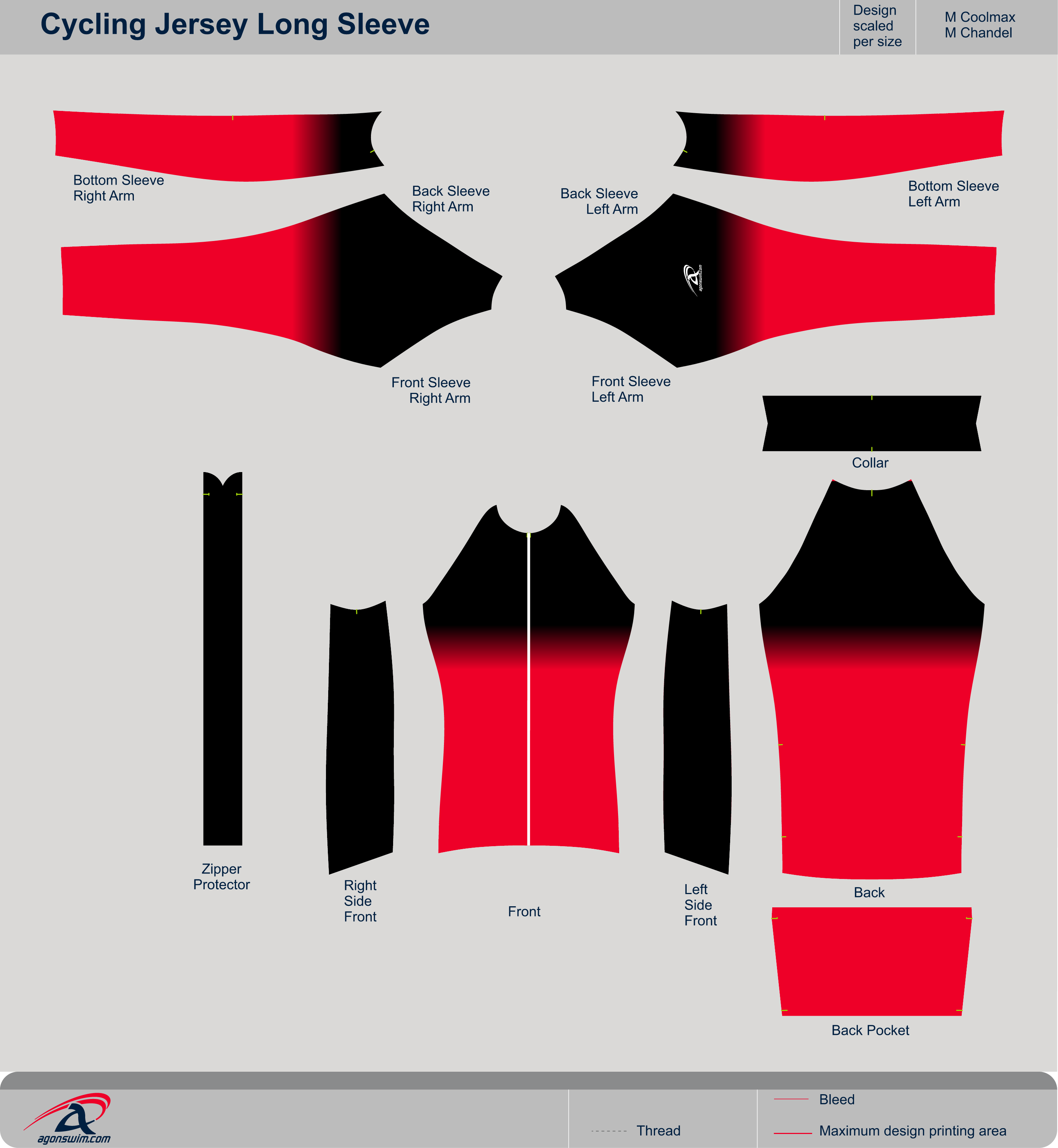 High, tight neck, full zipper, long sleeved cycling jersey with three back pockets with elastic at the top. Longer in the back than the front for full coverage in racing posture. Elastic-lined sleeve and shirt hem.