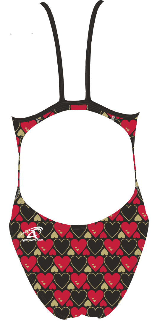 The Lazy-K back suit features a low scooped neckline and thin straps that are separate in the back where they connect to a narrow horizontal band of fabric, with medium bottom coverage.