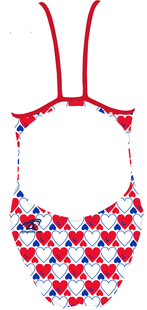The Lazy-K back suit features a low scooped neckline and thin straps that are separate in the back where they connect to a narrow horizontal band of fabric, with medium bottom coverage.